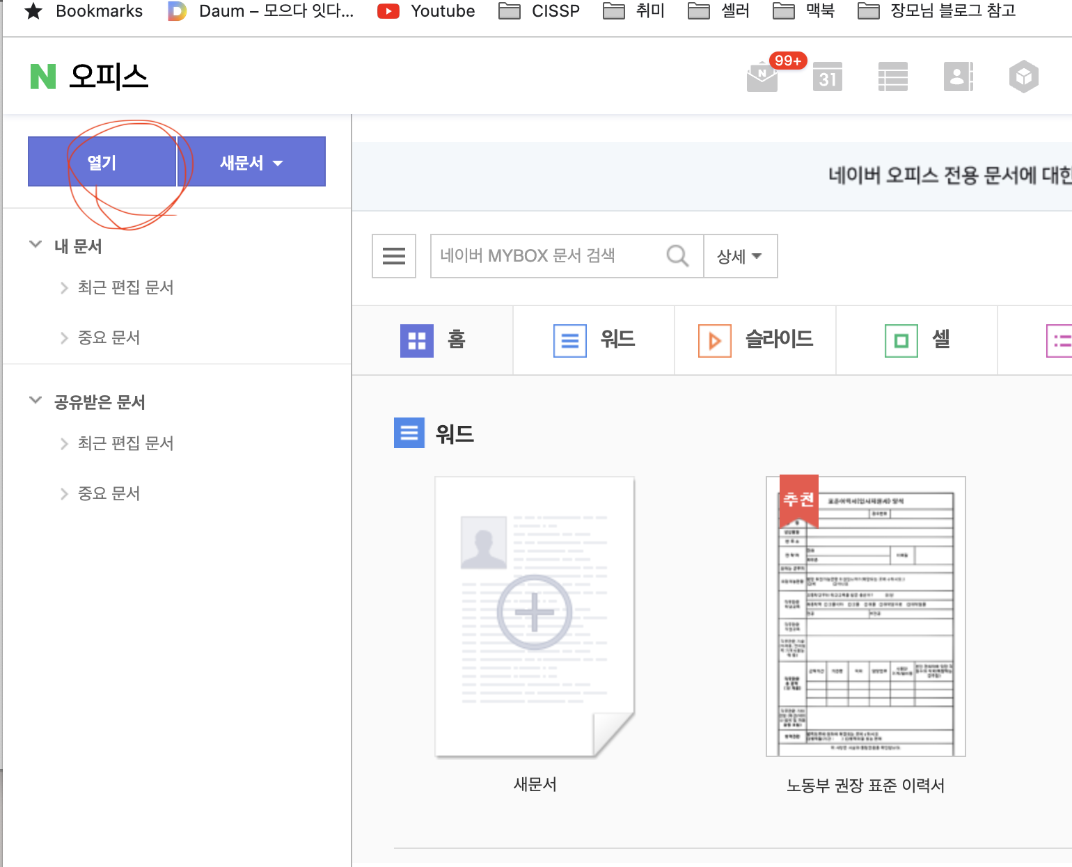 거기에서 네이버 오피스를 열어서
