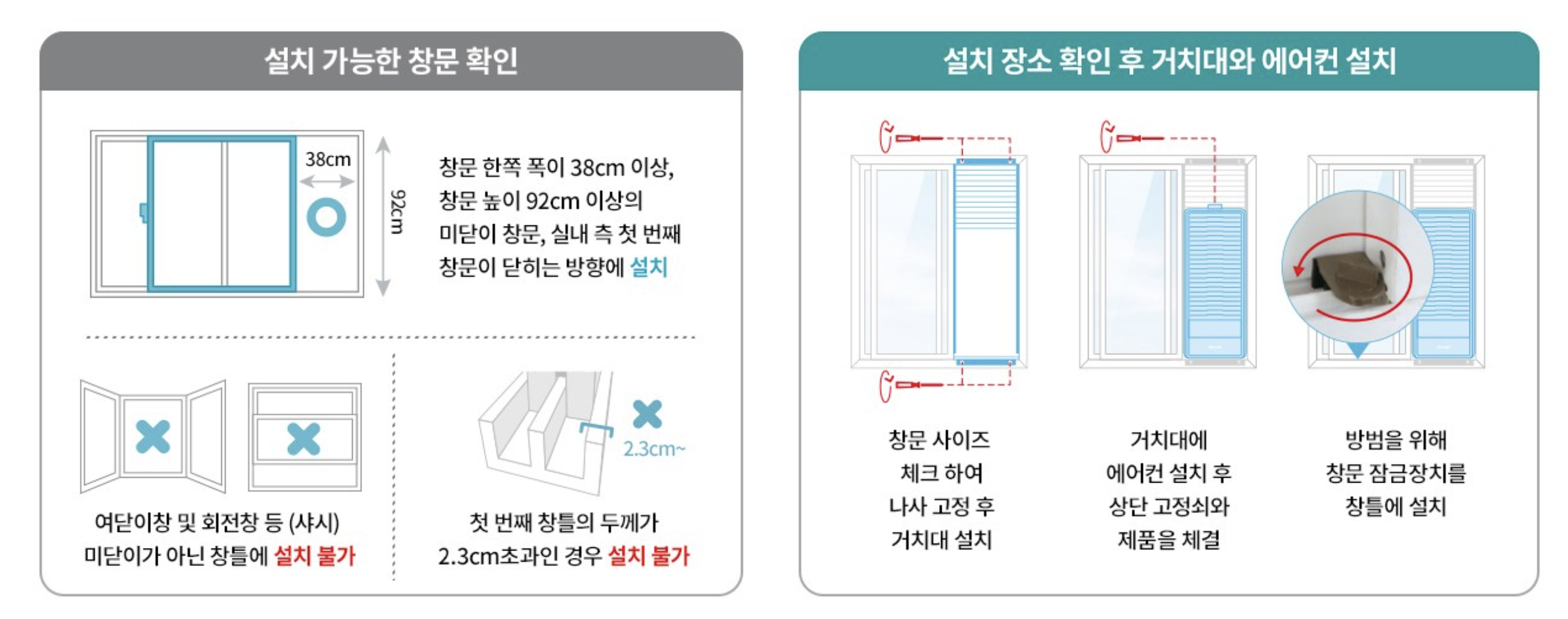 - 설치 시 주의: 설치 후 창문과 에어컨 사이 틈새를 확인하고 보완할 것.