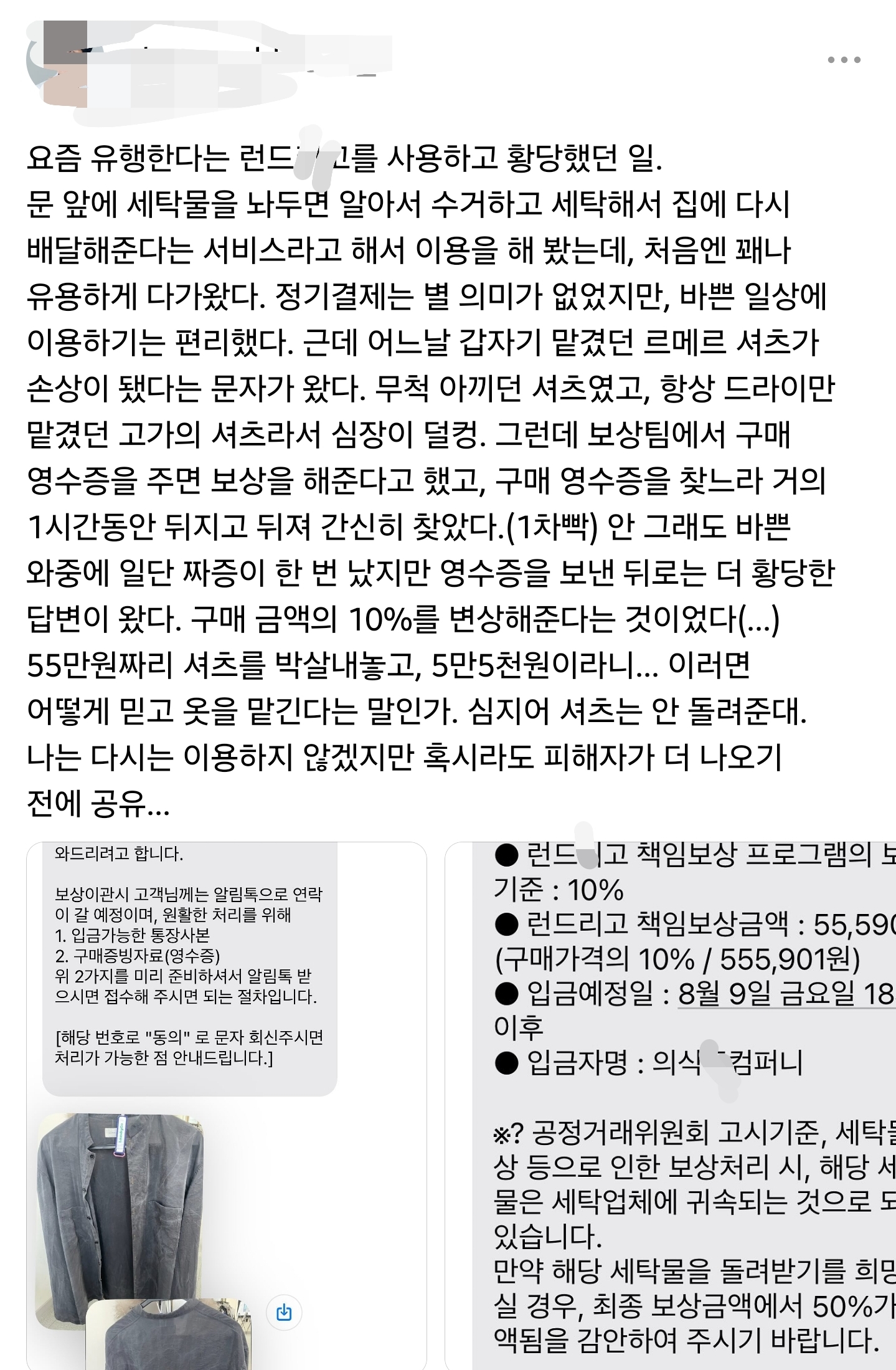 세탁서비스업체에서 고가셔츠 훼손 통보