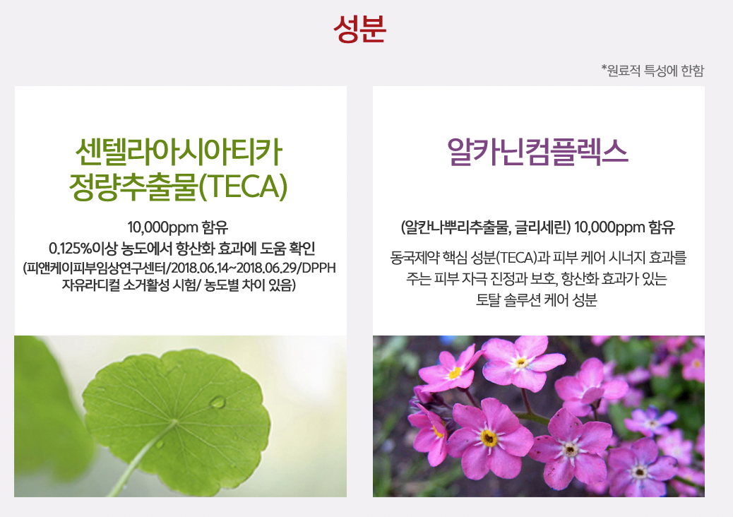 아래 성분 표에 보면 센텔라아시아티카 정량추출물 10,000ppm 함유되어있고, 0.125% 이상 농도에서 항산화 효과에 도움이 있다고 실험 결과를 써놓았다. (피앤케이피부임상연구센터) 일반인에게 와닿지는 않는다...