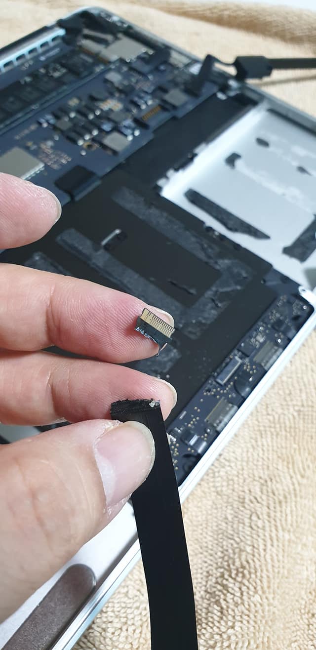 역시 글로벌 똥손.. 결국 배터리 위로 지나가는 트랙패드 케이블을 잘라버림 ㅎㅎㅎㅎㅎ ㅠㅠ